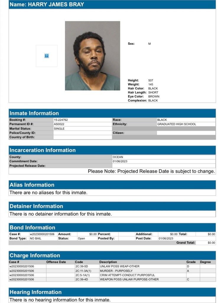 Later in the evening on January 5, 2023, Bray was taken into custody, without incident, in Manchester Township by Detectives from the Ocean County Prosecutor’s Office Major Crime Unit and Brick Township Police Department. Bray was thereafter transported to the Ocean County Jail, where he is currently lodged pending a detention hearing.