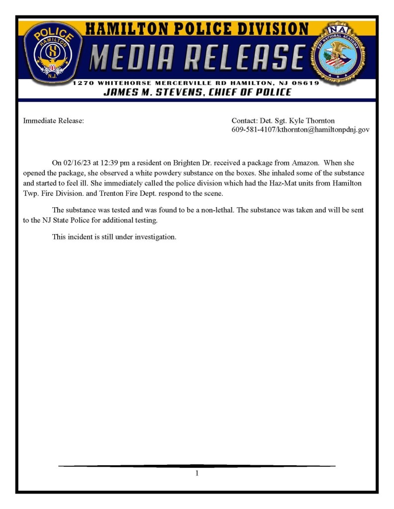 HAMILTON: The Hamilton Police Department released the following letter regarding a substance