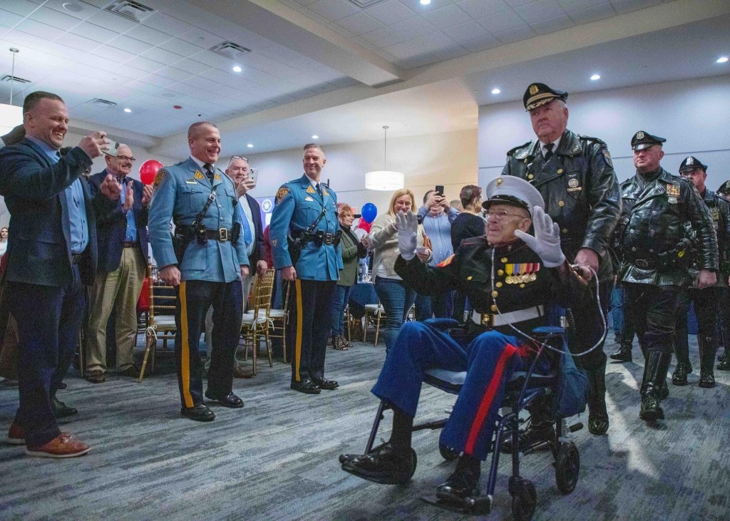 The NJSP shared the following information: Happy 100th Birthday to an American Treasure, World War II Veteran, Corporal Roland Scarinci! New Jersey State Police Superintendent Colonel Patrick Callahan, Lt. Colonel Brent Warne and State Troopers attended Roland Scarinci’s 100th Birthday Bash at the Fraternal Order of Police Hall in Philadelphia on Saturday.
