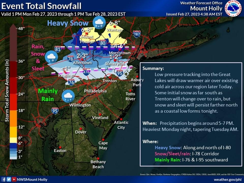 This is the latest from the National Weather Service: Since yesterday, forecast snow amounts have increased by 1″ along the I-78 corridor, and by about 2″ near & north of I-80. Farther south toward Philadelphia & Trenton, there might some brief sleet pellets or snowflakes initially early this evening, but expect mainly rain tonight. See the latest expected storm totals in the graphic.