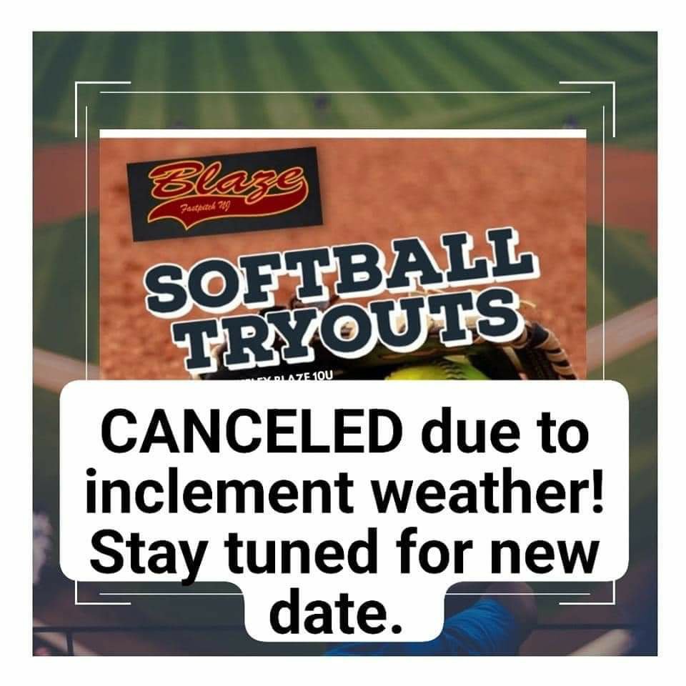 Blaze 10U tryouts are going to be rescheduled due to inclement weather tonight. Later date to be determined and will be posted on Berkeley Girls Softball League social media.