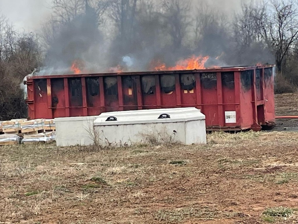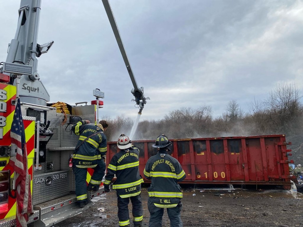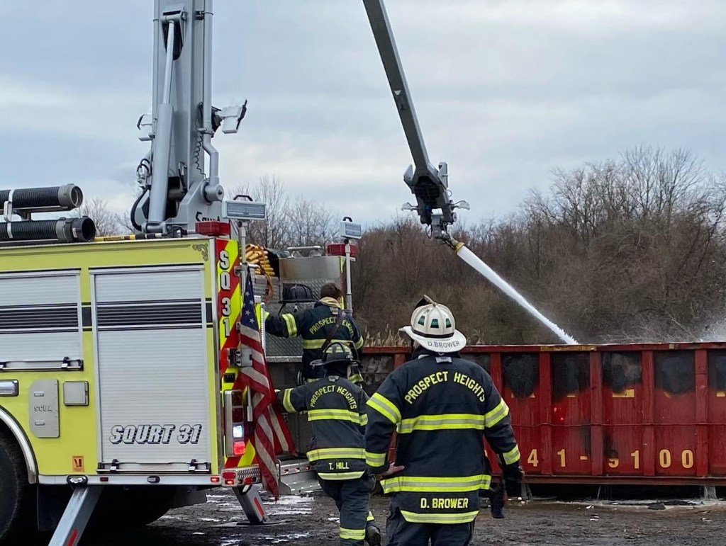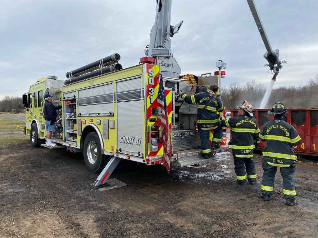 EWING: Prospect Heights Fire Co shared the following information: All 3 Ewing fire companies dispatched to “smoke in the area” possibly around Jack Stephen Way by the airport. Investigation found a 30 yard dumpster in the far rear of Ewing Church Cemetery off of Scotch Road. The dumpster was fully packed with a variety of combustibles. Squrt 31 was supplied with multiple tanks of water by Squad 30 and Engine 33. Close to 10,000 gallons of water was used to finally put this out.
