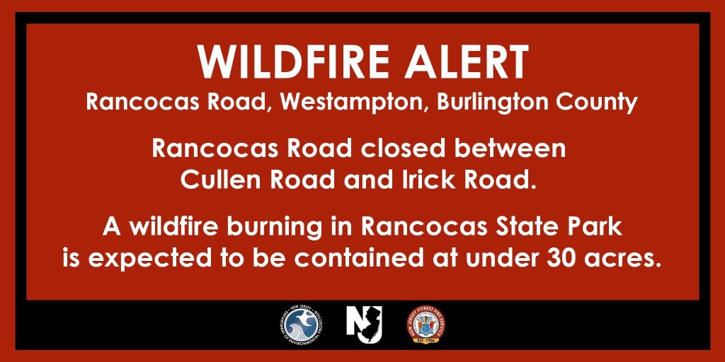 As of 9:00 pm, the wildfire in the Rancocas State Park is 100% contained by New Jersey Forest Fire Service.