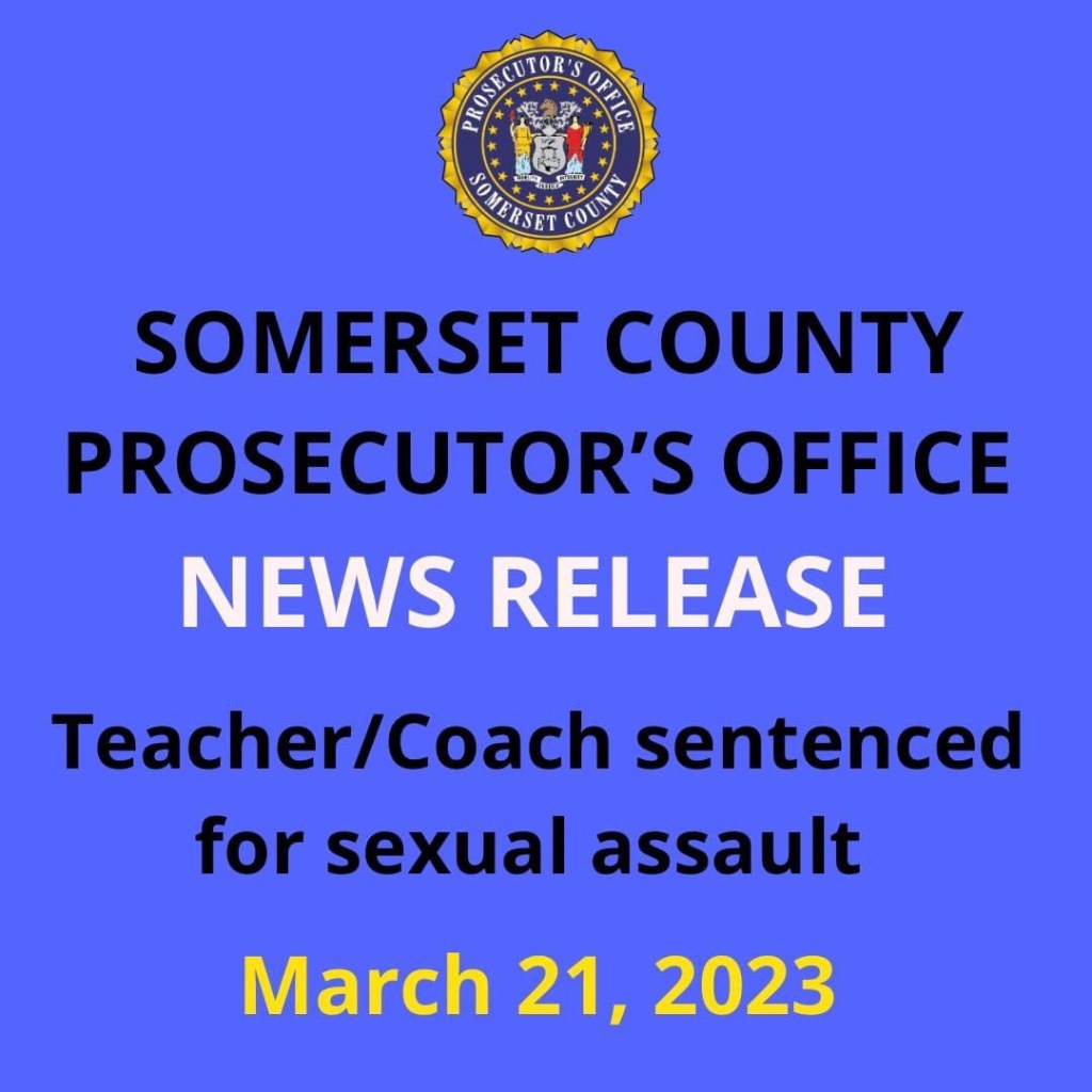 SOMERVILLE, N.J. – Somerset County Prosecutor John P. McDonald and Somerset County Prosecutor’s Office Chief of Detectives John W. Fodor announced that on March 17, 2023, Matthew Rennie, age 29, Ringoes, New Jersey, a former teacher, and coach was sentenced to four years in New Jersey State Prison for sexually assaulting a student.