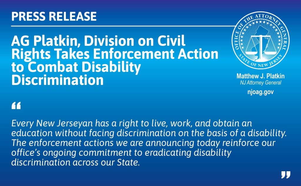 The NJ Attorney General’s Office issued the following statement: We’re taking action in 6 counties to combat disability discrimination. NJ’s Law Against Discrimination is clear: every resident deserves to live a life without unfair treatment because of their disability. If you flout our laws, you’ll be held accountable. https://bit.ly/3TPCyG9