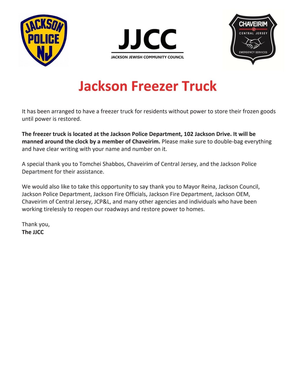 JACKSON: Freezer Trailer available to all residents. Package your frozen items as directed and bring them for temporary storage. For questions call 1-973-907-3153