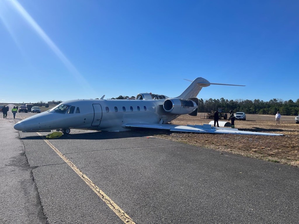 WALL TOWNSHIP: On 4/1/23 at 7:38 PM, Wall Township Police and Fire District 2 responded to Monmouth Executive Airport for an aircraft incident. Investigation on scene revealed a twin engine Citation jet left the runway while landing. It lost control upon entering a grass median, and came to rest on its underside off the taxiway.