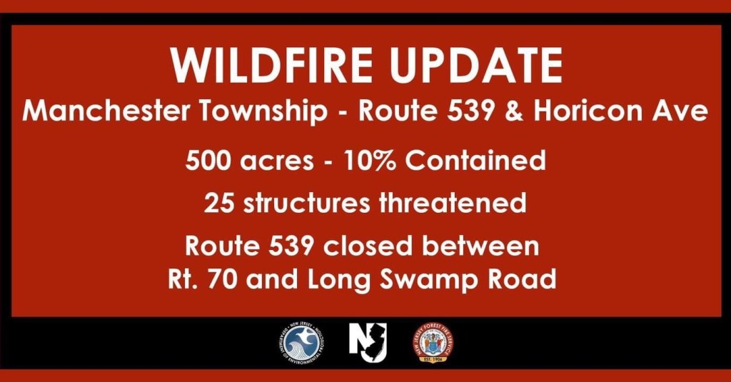 MANCHESTER: The New Jersey Forest Fire Service and Joint Base McGuire-Dix-Lakehurst Fire Department is in unified command battling a wildfire in Manchester Township on federal, state and private property on along Route 539 and Horicon Ave. The fire has reached 500 acres in size and is 10% contained.