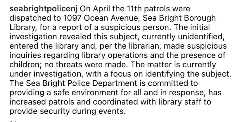 Last week the Rumson Police Department was made aware of an incident that occurred at the Sea Bright Library. The incident involved a male individual who walked into the library making inquiries about their operations and the presence of children. No threats were made.