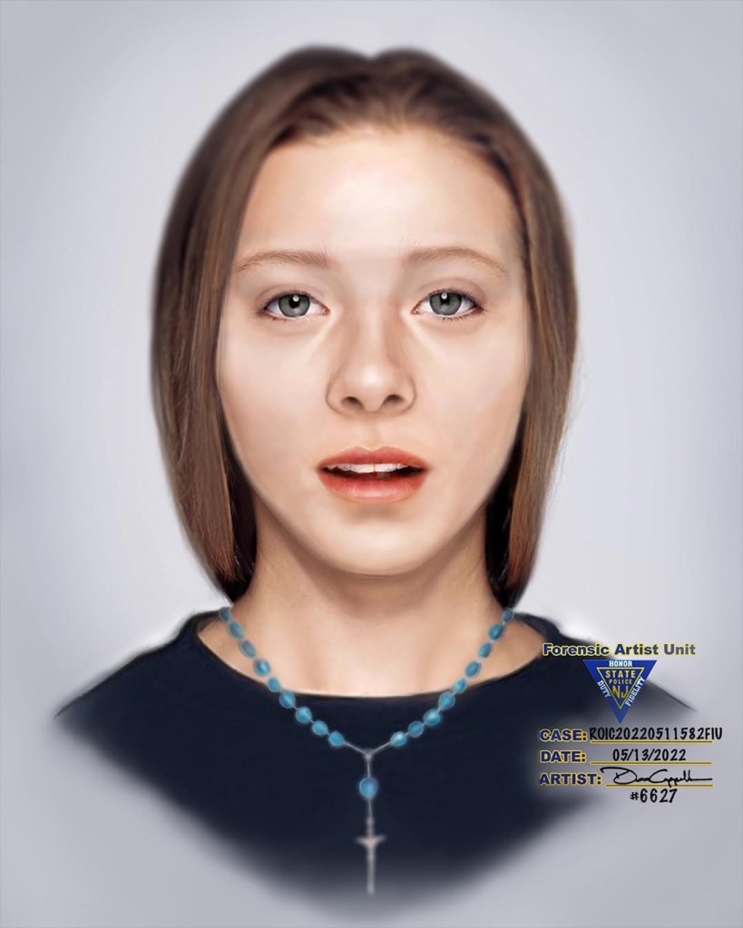 The victim is a Caucasian female, possibly of Northeastern European descent, estimated to be between 18-30 years of age, approximately 115lbs – 130lbs, 5’2” – 5”5” in height, fair skin with light brown or blonde hair and blue or green eyes. When found, she was wearing a red colored, long sleeve sweatshirt with a white undershirt style t-shirt over it, a white long- sleeve shirt wrapped around her waist, white socks, and white/black striped Adidas sneakers. The victim had short fingernails painted silver with white lines that come to a point. She had small scars on both hands, and a surgical scar on her lower abdomen approximately 2” long and no tattoos. The victim was in possession of a brown tote bag with the words “New York” on it. Inside the tote bag were a blue sweatshirt with a winter scene on it, black jeans with a zipper on both sides of the waist, a sun hat with blue flowers, a black and white bandana, and a blue & yellow scarf with yellow flowers. The victim was wearing a set of blue rosary beads and a wooden bracelet with religious icons (Saints) on it.