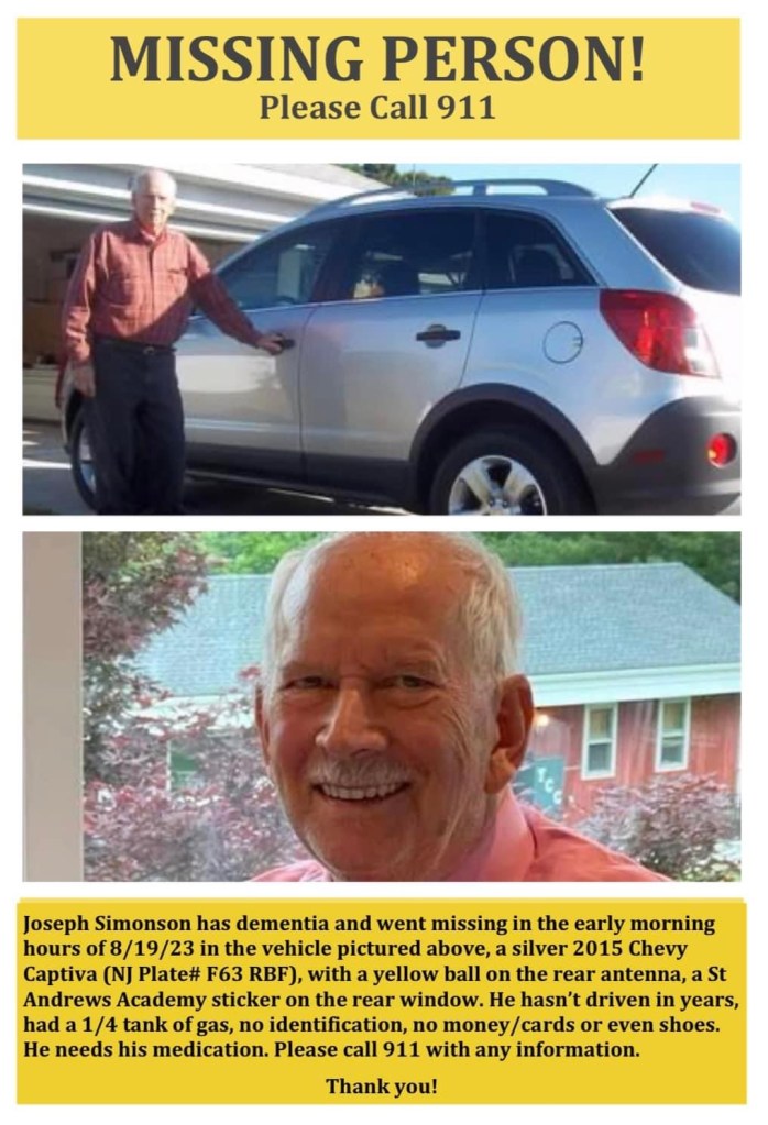WHITING: Joseph Simonson who has dementia went missing in the early morning hours of 8/19/23 in the vehicle pictured below. The vehicle is a silver 2015 Chevy Captiva (NJ Plate# F63 RBF), with a yellow ball on the rear antenna, and a St. Andrews Academy sticker on the rear window. He hasn’t driven in years, and only has a 1/4 tank of gas, no identification, no money, no credit, cards, and no shoes.