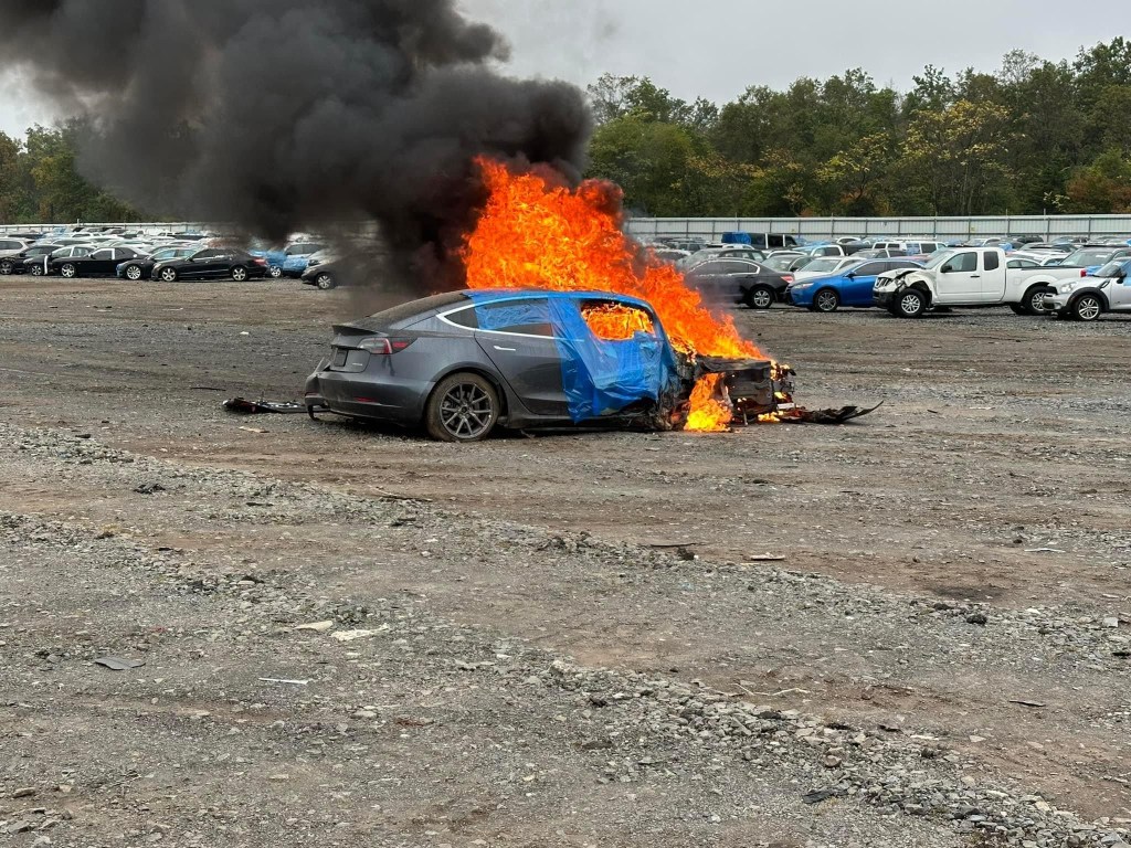 Given the location of the vehicle, the decision was made to allow the car to burn itself out, then cool any remaining battery packs with water. District members were on location with County Hazmat for several hours.