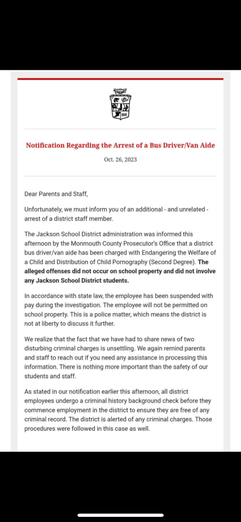 The Jackson School District administration was informed this afternoon by the Monmouth County Prosecutor’s Office that a district bus driver/van aide has been charged with Endangering the Welfare of a Child and Distribution of Child Pornography (Second Degree). The alleged offenses did not occur on school property and did not involve any Jackson School District students.