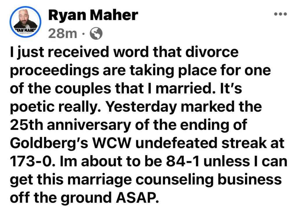 ”I just received word that divorce proceedings are taking place for one of the couples that I married. It’s poetic really. Yesterday marked the 25th anniversary of the ending of Goldberg’s WCW undefeated streak at 173-0. Im about to be 84-1 unless I can get this marriage counseling business off the ground ASAP.”