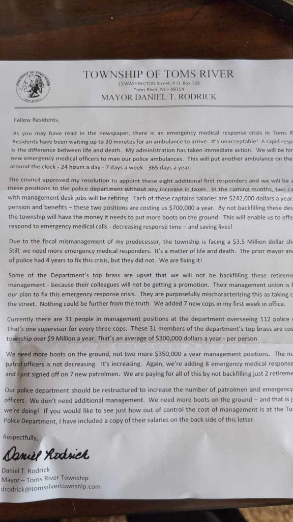 On January 26, 2024, many of you probably received a letter from Mayor Daniel Rodrick mailed to all residents of Toms River. As Chief of Police, it is my duty to ensure that accurate information is disseminated so everyone in the community can make informed decisions about important matters that impact the safety and well-being of you and your family. Let me assure you that our PBA Police Officer Union, the FOP Supervisor’s Union and the Chief’s Office stand united with the increase in personnel in our EMT program. The overall safety of our residents is our number one priority and we are proud of our average response time of 9.6 minutes by our EMTs in a community spanning 44 square miles. Unfortunately, even with extensive recruiting efforts, the pool of EMT applicants has been almost non-existent for some time, as other agencies are also in need of emergency medical personnel. Additionally, police officers outfitted with first aid equipment and defibrillators are also dispatched to emergency medical calls and often first on the scene to start emergency treatment in anticipation of the EMTs’ arrival.